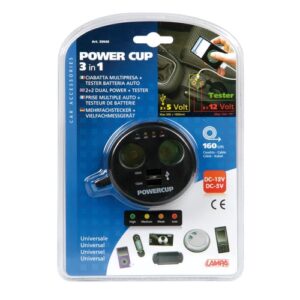 USB lader “Power Cup” input 12 Volt – output 2x 5V USB max 1000 mA – 2 stuks gezekerd 10 ampere – accu tester – 160 cm kabel