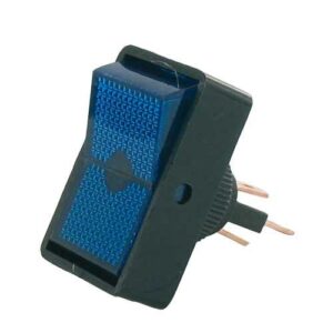 Wip schakelaar – aan / uit – blauw verlicht – 12 Volt 16 Ampere – inbouwmaat Ø 15 mm – Opbouwmaat b19xh34xd10 mm – schuif contacten